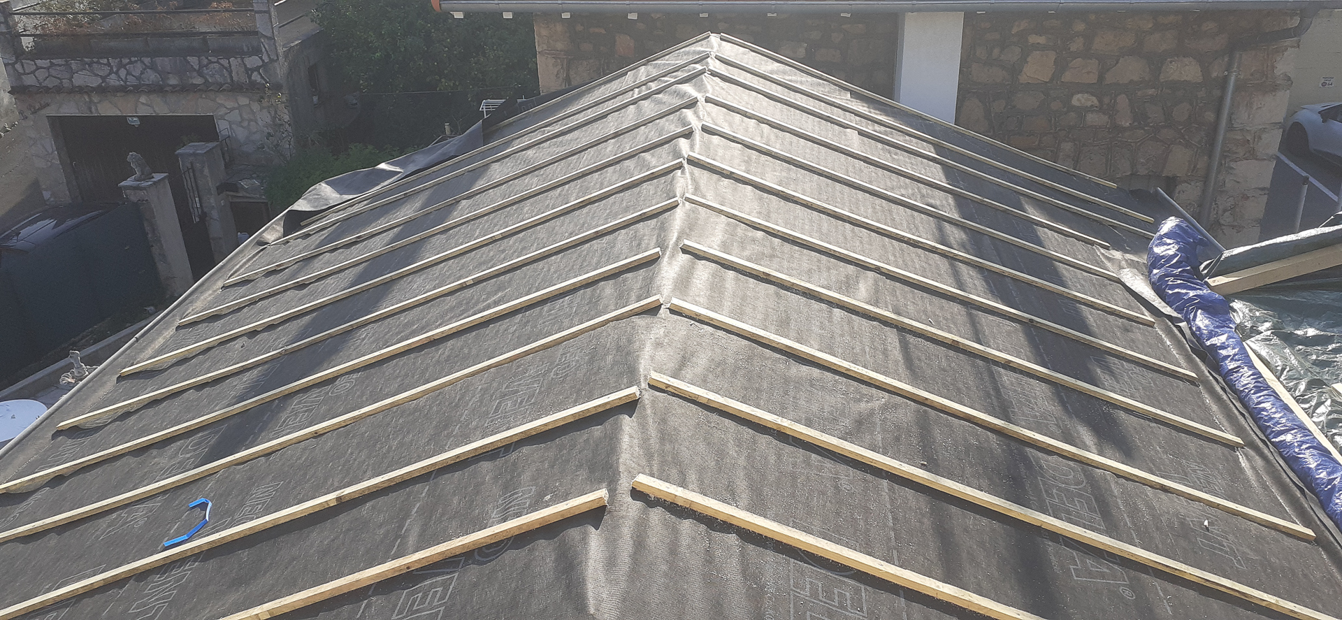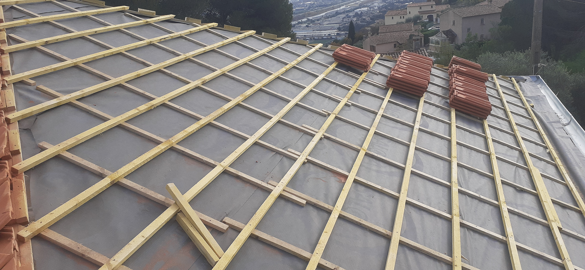 - Un lattage en bois neuf installé sur la surface du toit, créant un quadrillage régulier qui servira de support aux tuiles