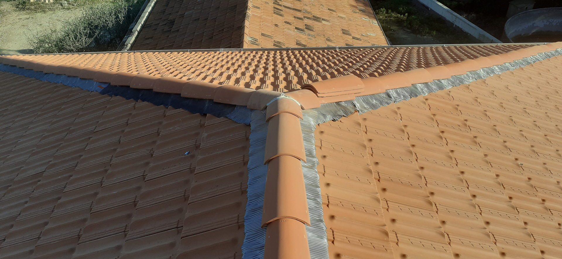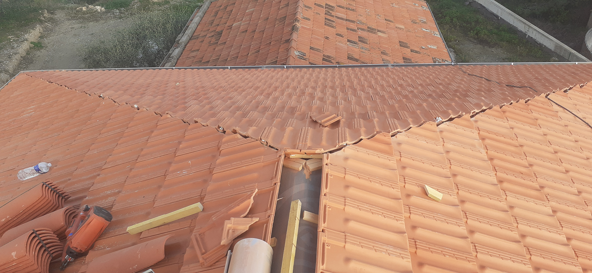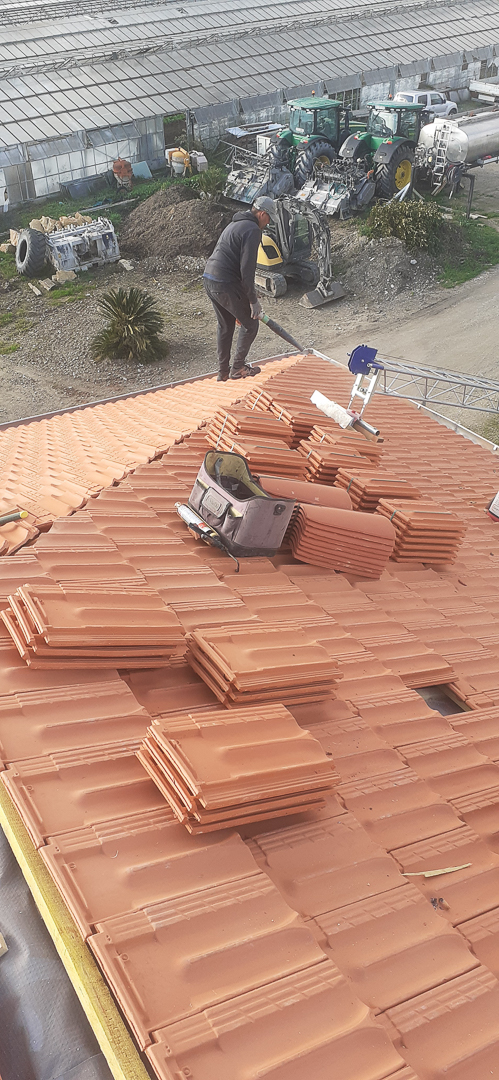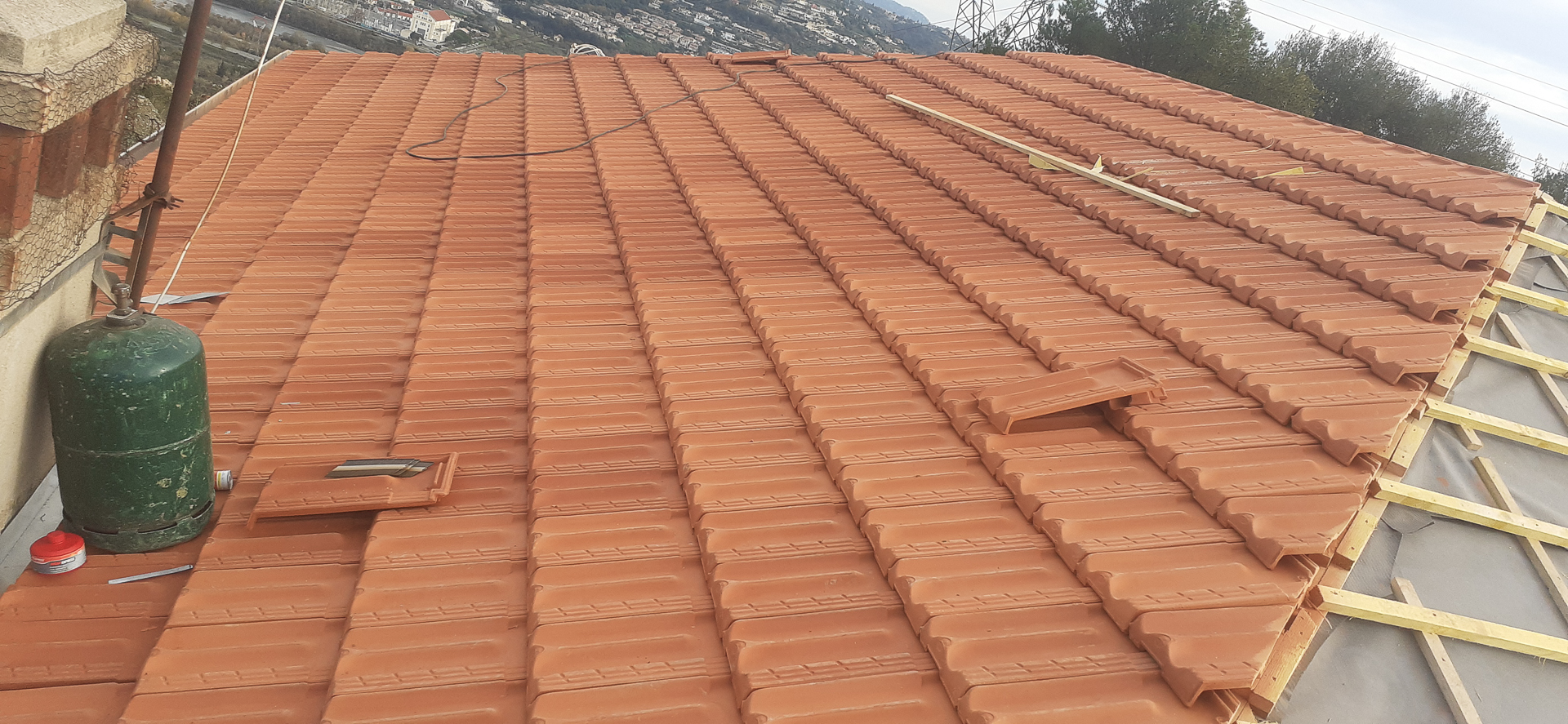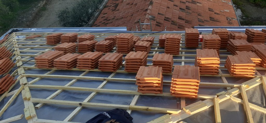 Cette photo illustre bien le professionnalisme du travail de rénovation, avec une attention particulière portée à la préparation du support et à l’organisation du chantier. Les tuiles neuves, de couleur terre cuite traditionnelle, assureront une protection durable et s’intégreront parfaitement dans le paysage local.