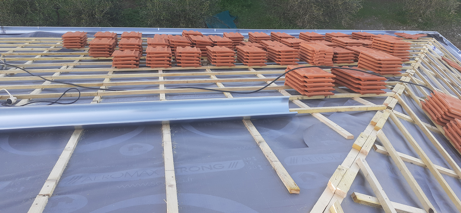 - Des piles de tuiles neuves en terre cuite disposées de manière organisée sur le toit, prêtes à être posées